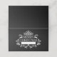 This folded name place card is shown in Black with a White festive, yet classic, Merry Christmas graphic print or deer, bells holly and flourish. Space to handwrite each name personally.