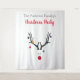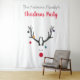 A tapestry for a holiday, Christmas party used as a party wall decoration, welcome banner and as a photo booth backdrop. A white background, decorated with a modern, abstract reindeer head with a red nose. With Christmas ornaments, baubles hanging from the antlers. Personalize and add your family name, black letters. With the text: Christmas Party written with a modern red hand lettered style script.