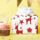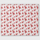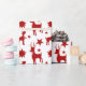 Wrapping paper with an illustrated pattern, red silhouettes with adult and young reindeer, with golden stars in the background, perfect wrapping supply for your Christmas holiday season