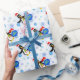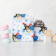 A cartoon penguin dressed up with a Santa hat and winter scarf wishes you a Merry Christmas. Snowflakes on a blue and white gradient background surround the cute cartoon penguin.