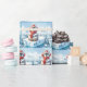 A cute watercolor penguin sitting on an iceberg wearing a red scarf, hat, and earmuffs with snowflakes.