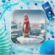 Cute penguin wearing a red cap and scarf perched on an iceberg with a Merry Christmas sign in Antarctica.