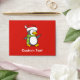 A little penguin cartoon with santa hat and green scarf walking on snow.