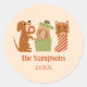 Cute and festive Christmas favour sticker featuring hand drawn illustration of cats and dogs in holiday theme. The background is yellow.