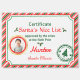Celebrate the magic of Christmas with an official Santa's Nice List Certificate, designed to delight children of all ages. This charming certificate includes a space for a precious photo, a festive border in green and red candy cane stripes, and a special 'Approved by the elves at the North Pole' message. It's a wonderful way to commemorate a child's good deeds and spread holiday cheer. This certificate is a delightful keepsake that captures the wonder of Christmas morning and the joy of being on Santa's Nice List.