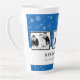 Christmas Photo Collage Blue Snowflake Family Latte Mug. Festive Christmas holiday photo mug with three photos collage, Merry Christmas and custom text. Insert 3 favourite photos into the template. Personalize the text any way you wish. The background are beautiful white snowflakes on a blue. Great as a Christmas gift or a keepsake mug.