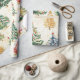Be a bit more festive and colourful with your pine trees wrapping paper choice when you use this festive pattern. Not only do you have lovely green vintage watercolors, intermixed are unexpected and pretty coloured trees in muted but fun pink, red, blue, and yellow. All decorated for the Christmas holidays with stars or bows at the tops and shiny baubles, even though pictured out in the winter snow.