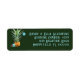 Tropical-themed Christmas address label with pineapple and ornaments design. Very dark green stickers with printed, light blue text. Four lines of text will fit. A little brown sea star / starfish decorates the pineapple hung with aqua blue ornaments.