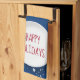 Snowman on Happy Holidays text on white plate and silverware on blue background and snowflakes.