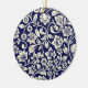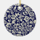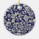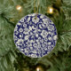 This beautiful porcelain Christmas ornament is the perfect addition to your tree this holiday season. The intricate blue and white floral design is sure to catch the eye and add a touch of elegance to your decor. It is round and has a golden string for hanging. The design is intricate and covers the entire surface of the ornament.