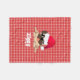 Cute red plaid blanket with adorable scruffy grey dog in Santa hat.