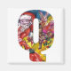 Q bold alphabet letter Xmas monogram design .Colourful, whimsical and artistic acrylic painting for Christmas. Santa Claus ,snowy Winter night with floral ornaments,green decorative plants,holly berries,mushrooms,puppets and toys in the snow by Bulgan Lumini (c)