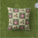 Four squares in green and tan are adorned with red ornaments decorated with white snowflakes and green holly with red berries. White stitching adds a decorative touch, giving the repeating pattern the appearance of a quilt, creating a perfectly cozy feeling for the Christmas holiday.