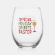 Quote: Official Holiday Spirits Taster. Red, green text. Decorated with a glass of wine