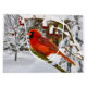 Decorate for the holidays with this image of a red cardinal bird sitting on a snowy branch of tree. A snow covered house is seen in the background and a branch with red berries hangs over the cardinal's head.