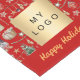 A classic red background with a traditional Scandinavian style Christmas farmhouse decor, gnomes, wood logs,pine trees. Personalize and add your business, company logo. Text: Happy Holidays. Golden letters. If you want the runner without text, use your back-space key to delete.