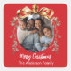 Red background. Personalize and add your own photo. A golden Christmas tree bauble as frame. Add your family name.