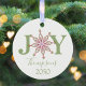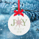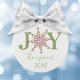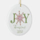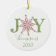 Simple snowflake typography design. A personalized custom modern holiday Christmas photo ornament that features name and year. A wonderful addition to your family tree or makes a great gift. This design features Christmas holiday red and green, cute snowflake joy typography, holiday home décor, festive whimsical winter script, winter colourful bright, Christmas tree décor, family personalized name, custom customize simple minimalist, Christmas decoration, Christmas gift ideas
