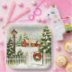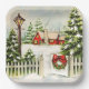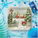 Cute red cottage set behind a white picket fence, decorated with a Christmas wreath with red bow. Lantern is lit as a welcoming sign to family and friends for the holidays.