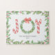 This Christmas candy cane joy and wreath jigsaw puzzle is perfect for a holiday family gathering. This beautiful design features hand-painted watercolor red and white candy canes and a greenery wreath with a lovely red bow. The frame is an elegant watercolor green and red holly. Part of the Candy Cane Joy collection. (Personalize family name and date)
