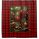 Pretty red plaid with a beautiful image of bright red Christmas candles, pine cones, red berries and holly on a wooden window sill. Background pattern is a red and black tartan plaid.