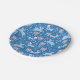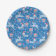 Cute singing birds with prancing deer jumping over Christmas presents with musical notes, snow and stars, graphic patterned Christmas paper plate in shades of bright blue, red and white. Ideal for Christmas parties.