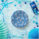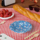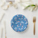 Cute singing birds with prancing deer jumping over Christmas presents with musical notes, snow and stars, graphic patterned Christmas paper bowls in shades of bright blue, red and white. Ideal for Christmas parties. Original art and design by www.mylittleeden.com