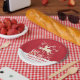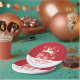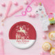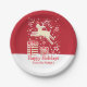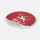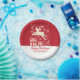 Cute prancing reindeer jumping over Christmas presents with snow and stars, graphic Christmas paper plates in shades of bright red, maroon red, yellow cream and white. Personalize with your own family name or greeting. Ideal for Christmas parties.