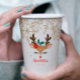 Christmas Reindeer girl birthday party cups with cute reindeer face and gold glitter snowflakes.