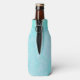 Bottle cooler / cozie with a cute whimsical illustration of a funny Christmas reindeer in an ugly sweater, perfect for the holiday season. He is standing on 2 legs and waving hello. He has big antlers and a cute green knitted winter cap. Text below says Merry Christmas in a handwritten font in a festive red colour. The background is a blue frosty icy looking watercolor des