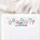 A festive address label featuring holiday themed icons like a gingerbread man, Christmas tree, and ornaments.