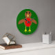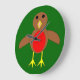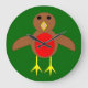 This awesome clock features a cute Christmas Robin character with a bright red breast, brown body and beady black eyes. It has its yellow beak wide open as it sings a Christmas carol. Its wings are outstretched as it joyously waits for Christmas.