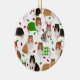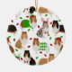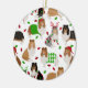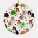 Cute Rough Collie dogs dressed in festive holiday outfits, Santa hats and argyle sweaters with scattered Christmas ornaments.