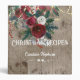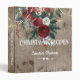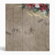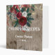 Rustic recipe binder is done up for Christmas with lights and red Christmas roses and evergreens. Pretty fonts in white have title, personalized name and extra ornaments of hearts and swashes. Barn wood effect is a backdrop that gives everything a farmhouse feel.