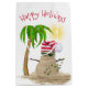 Cute snow sandman on the beach with sunglasses and stocking cap holding a holiday light string under Christmas palm tree.