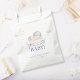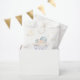 The "Santa Baby" shower favour bag has a sweet, festive design, featuring a baby in a blue Santa hat with soft clouds and stars. It uses playful red script and pastel tones, creating a cozy holiday feel, perfect for a winter baby shower.