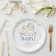 The "Santa Baby" shower paper plates has a sweet, festive design, featuring a baby in a blue Santa hat with soft clouds and stars. It uses playful red script and pastel tones, creating a cozy holiday feel, perfect for a winter baby shower.