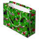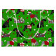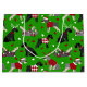 Cute Christmas Schnauzers with salt and pepper and black and silver coats wear Santa hats, antlers and argyle sweaters on a green background with scattered ornaments.