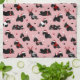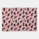 Cute Scottie dogs dressed in festive holiday outfits, Santa hats and argyle sweaters with scattered Christmas ornaments on a pink background.