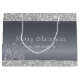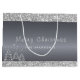 A faux silver looking background with faux silver glitter ribbons. With the text: Merry Christmas written with a modern hand lettered style script. Template for Your family name, white letters. Modern, simple and elegant. Christmas trees, winter forest as decor.