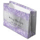 A faux silver looking background decorated with violet, lavender coloured faux confetti, sparkles. Personalize and add your family name. Text: Merry Christmas.