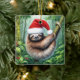 A sloth wearing a Santa hat hangs comfortably from a branch in the middle of a lush rainforest