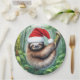 A sloth wearing a Santa hat hangs comfortably from a branch in the middle of a lush rainforest