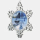 Pewter snowflake Christmas ornament shown with a winter snow scene print.