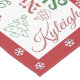 This is a fabric table runner with a white, red, and green Christmas design, featuring six names (more/fewer names can be used), as well as outlines of Christmas trees, ornaments, gifts, and stocking on a white background. It is trimmed in a snowflake design with red background. Please message MineByDesign for help with this design, or anything you envision!