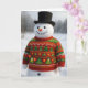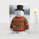 A charming snowman wearing a stylish top hat and a vibrant red and green Christmas sweater with glowing lights stands in a winter field.