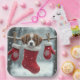 A St. Bernard puppy peeks out from a red Christmas stocking hanging on a line between two matching mittens