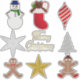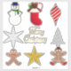 Christmas themed stickers, including an snowman, a stocking filled with goodies, an ornament, a snowflake, a holiday message, a Christmas tree, A gingerbread man, a star, and a gingerbread woman.