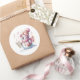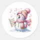 Christmas sticker is shown in a round shape with a cute festive pink snowman art print.