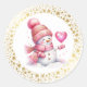 Christmas sticker is shown in a round shape with a cute festive pink snowman art print.